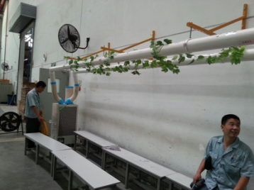 解决方案: 在员工休息区使用公司SAC-45工业冷气机,在休息位置上方做固定位冷风延长管,并间隔开孔,是冷风均匀吹到下方休息的员工处。
