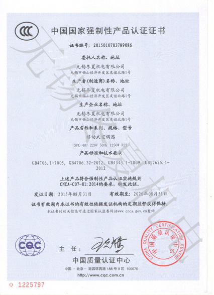 近日,星空官方网页版-星空(中国)的移动工业冷气机、暖风机产品7个型号取得了中国质量认证中心颁发的3C强制认证证书。